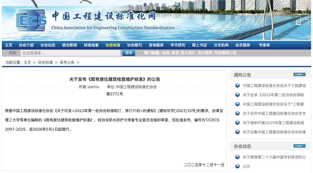 2025年12月11日,中國工程建設(shè)標(biāo)準(zhǔn)化協(xié)會(huì)(CECS)正式批準(zhǔn)發(fā)布了兩項(xiàng)關(guān)鍵行業(yè)標(biāo)準(zhǔn)——《既有公共建筑檢查維護(hù)標(biāo)準(zhǔn)》(T/CECS 2098-2025)與《既有居住建筑檢查維護(hù)標(biāo)準(zhǔn)》(T/CECS 2097-2025)。該兩項(xiàng)標(biāo)準(zhǔn)的制定是基于協(xié)會(huì)《2023年第二批協(xié)會(huì)標(biāo)準(zhǔn)制訂、修訂計(jì)劃》(建標(biāo)協(xié)字〔2023〕50號)的要求,由青島理工大學(xué)等單位牽頭編制,青島中邦科技新材料有限公司作為參編單位之一,為標(biāo)準(zhǔn)的制定貢獻(xiàn)了專業(yè)力量。